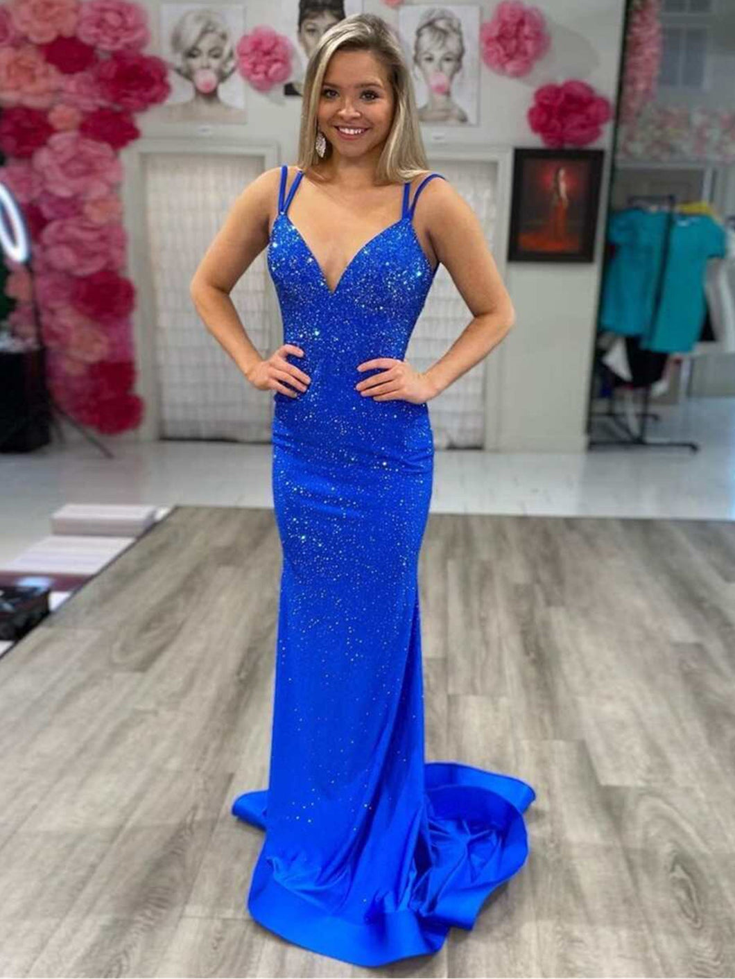 Introducing "Marlee." where modern allure meets timeless sophistication. This dress. sculpted from luxurious beaded jersey fabric. radiates elegance in every fold. Available in stunning shades of lilac. red. and royal blue. Marlee captures the essence of celebration. Its mermaid silhouette. a symbol of femininity and poise. seamlessly flows into a floor-length design. subtly highlighted by a graceful sweep train. The seductive V-neckline harmonizes with delicate double spaghetti straps. leading the eye to the enchanting cross open back. tastefully secured with a discreet zipper. A unique touch of pleats on the butt lends a playful dimension. making Marlee not just a dress but a statement of opulent style.