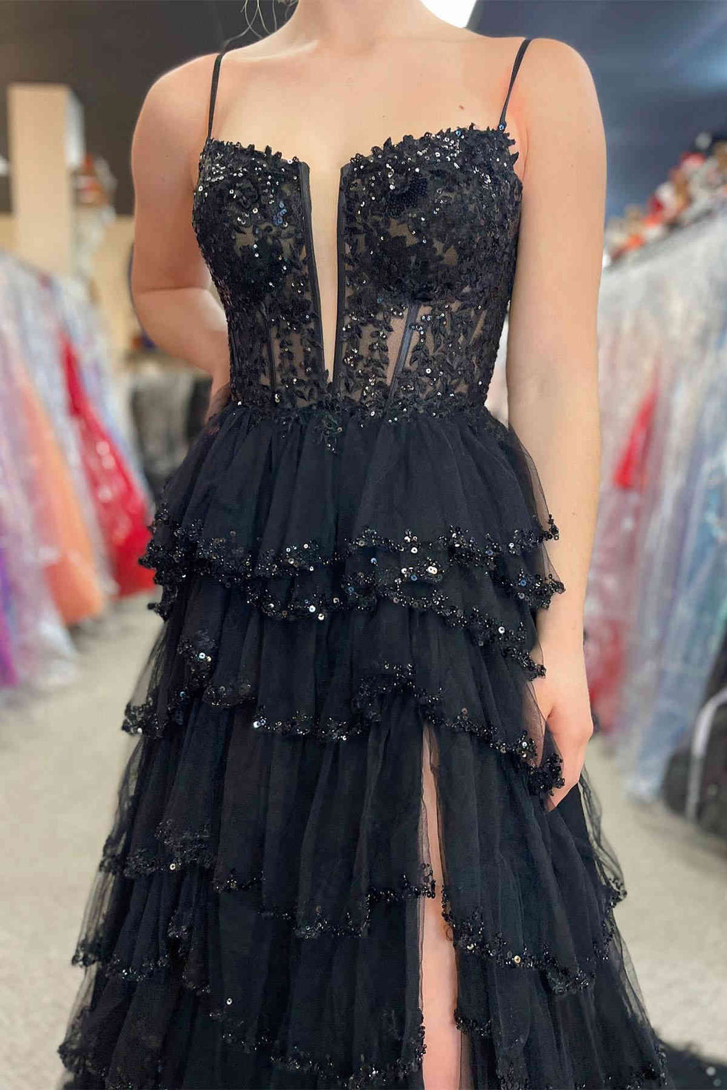 Step into the spotlight with the stunning Abbie Straps Black Mesh Cutout Sequined Layered Long Prom Dress. This captivating A-Line dress is crafted from luxurious tulle that flows effortlessly. creating a mesmerizing sweep train that adds drama to your every step. It is available in a variety of stunning colors. The spaghetti straps provide a delicate touch. while the illusion corset bodice showcases your shape with its intricate cutout design. This dress is a perfect choice for both evening dresses and formal dresses. adorned with its sequins that catch the light. adding a touch of glamour. and the layered ruffles bring movement and texture to the overall look. A daring slit enhances the dress's allure. making it perfect for making an unforgettable entrance. Whether it's prom. a gala. or a special celebration. the Abbie dress will have you feeling glamorous and ready to shine.