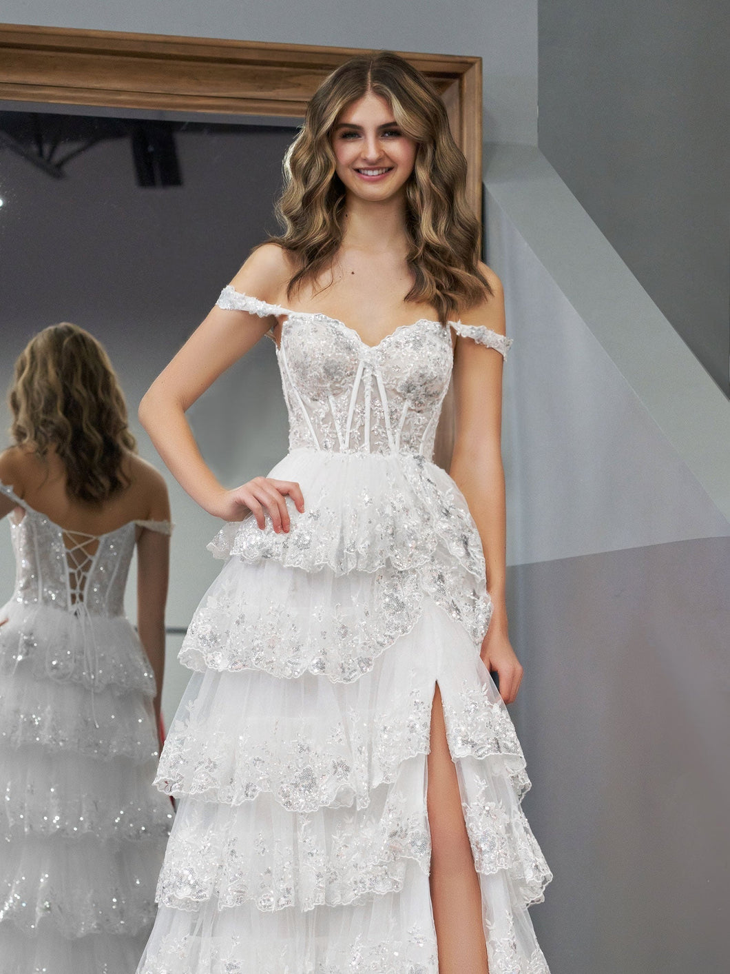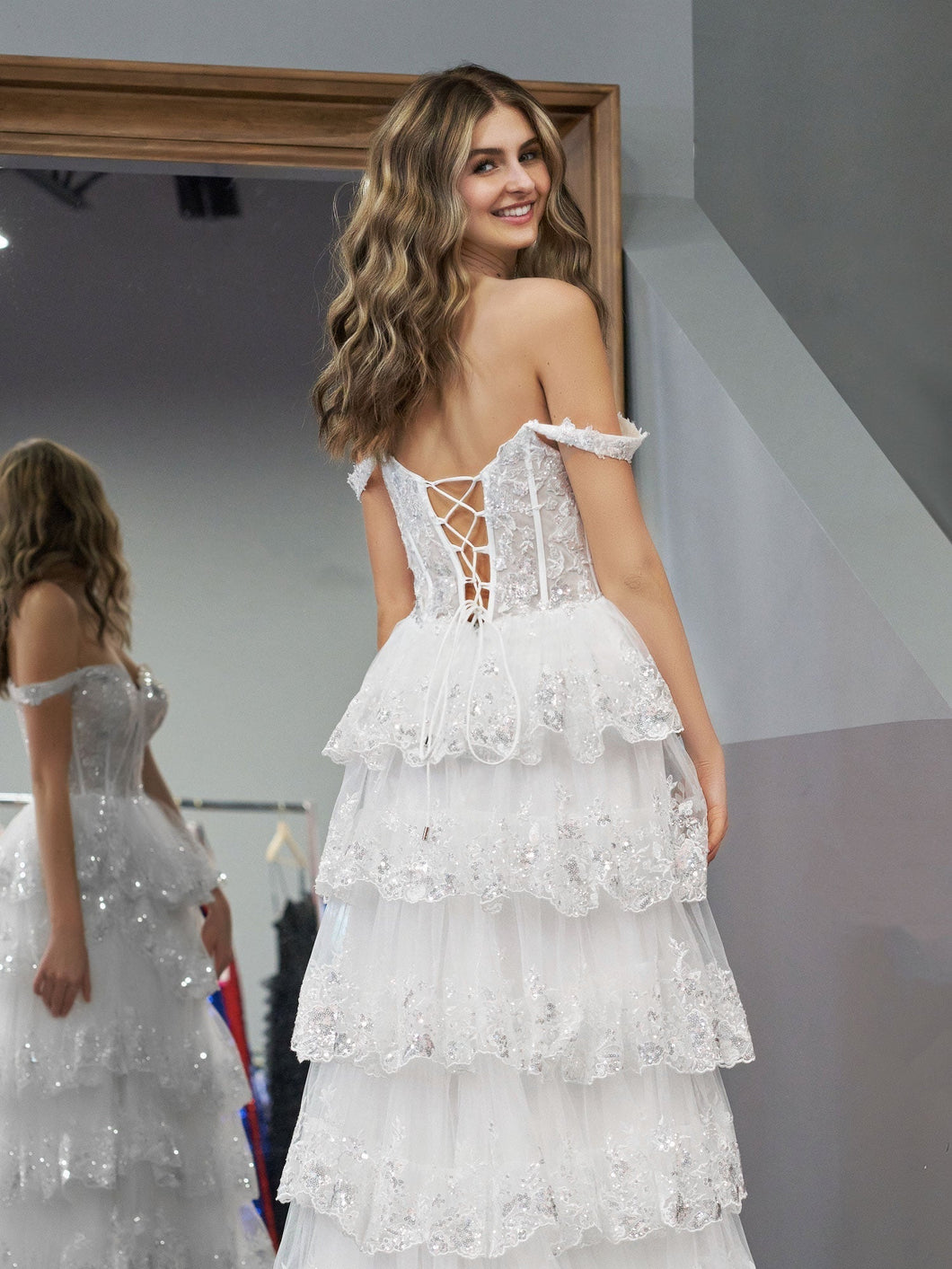 Are you ready to be the queen of prom night Our KissProm Princess A-Line Corset Prom Dress is the perfect dress for you! This stunning white dress features an off-the-shoulder design. delicate corset detailing. and beautiful lace ruffles that will have all heads turning in your direction. As soon as you slip into this gorgeous gown. you'll feel like royalty. The layers of airy tulle and exquisite lace trim make it feel like a dream come true. Every inch from bodice to hem has been carefully crafted with quality and precision for the princess in you! Our KissProm Princess A Line Corset Prom Dress was made for that magical evening so twirl. spin. and dance your way across the dancefloor feeling elegant. confident. and comfortable no matter what the spotlight throws your way.