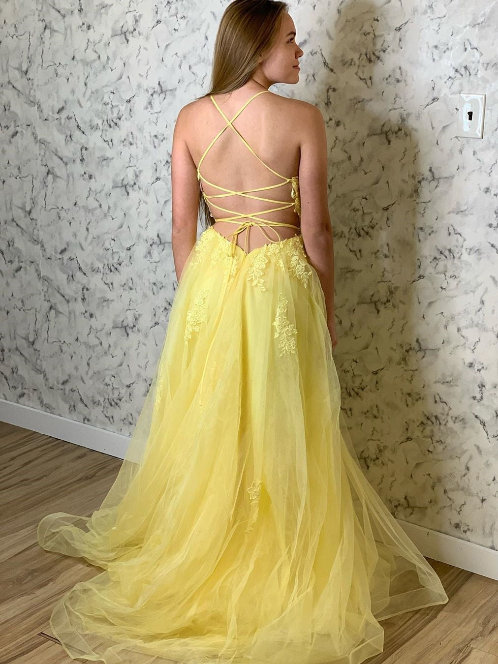 Look like royalty in this elegant Yellow Long A-line Tulle Lace Open Back Formal Prom Dress. Crafted from quality tulle fabric. this prom dress is designed to flatter your figure and make you stand out from the crowd. The lace open back detail provides a touch of classic sophistication. Create the perfect look for your special day.