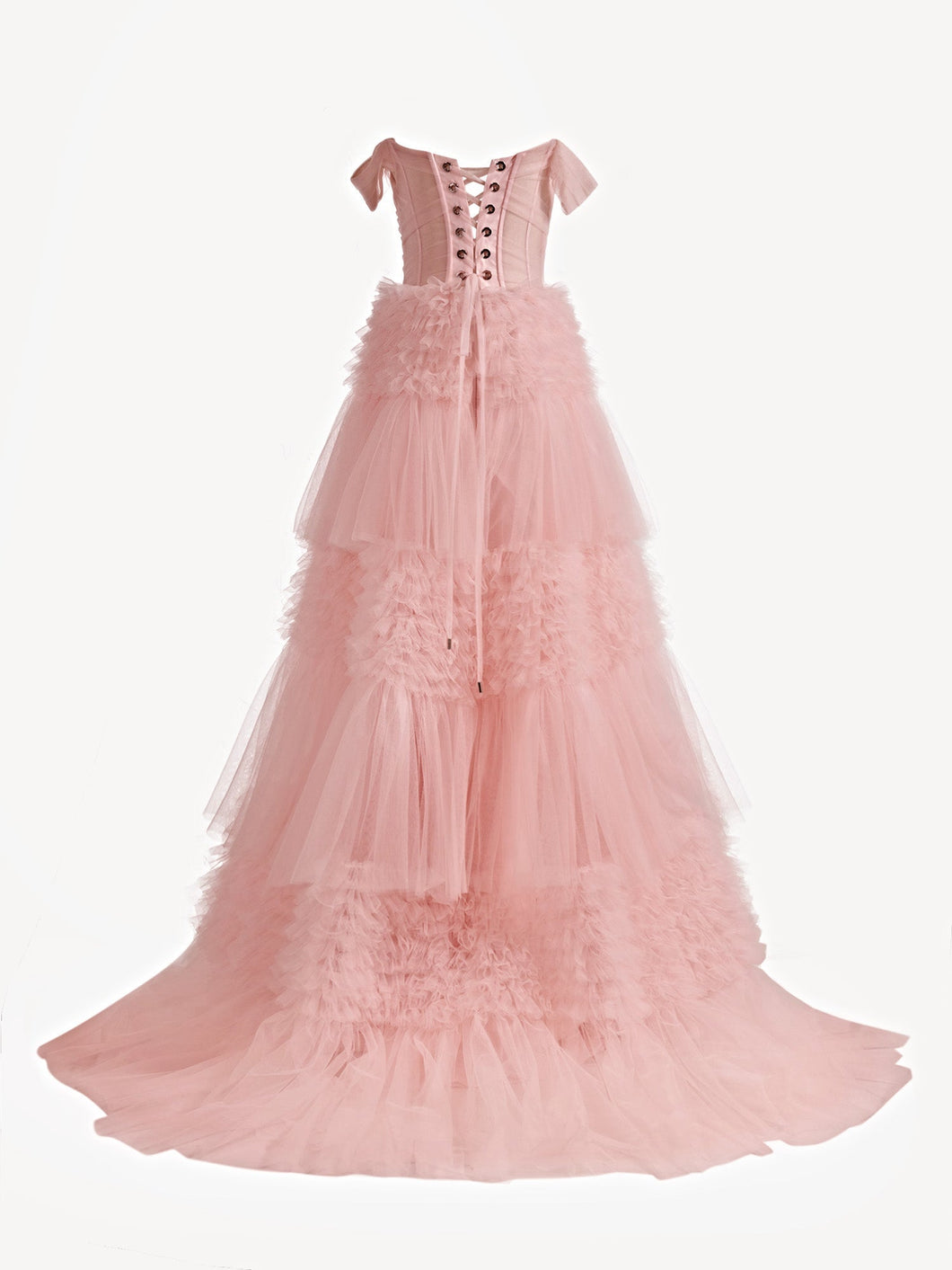 Meet Zariah. a confluence of classic romance and modern fairy tale elegance. With every step. this A-line blush tulle dress tells a story of timeless beauty. enchanting all with its soft hue and dreamy silhouette. The illusion corset bodice. exquisitely pleated. enhances your form while the off-the-shoulder neckline unveils a touch of modern grace. Descending from the bodice. multi-tiered ruffles cascade. forming a gentle sweep train that whispers tales of opulence with every graceful move.