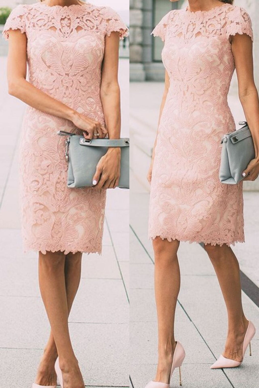Chic Pink Cap Sleeves Lace Knee Length Short Prom Dresses