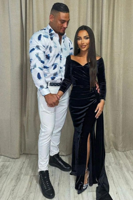 Elegant Velvet Long Black A-line Split Evening Dresses With Sleeves