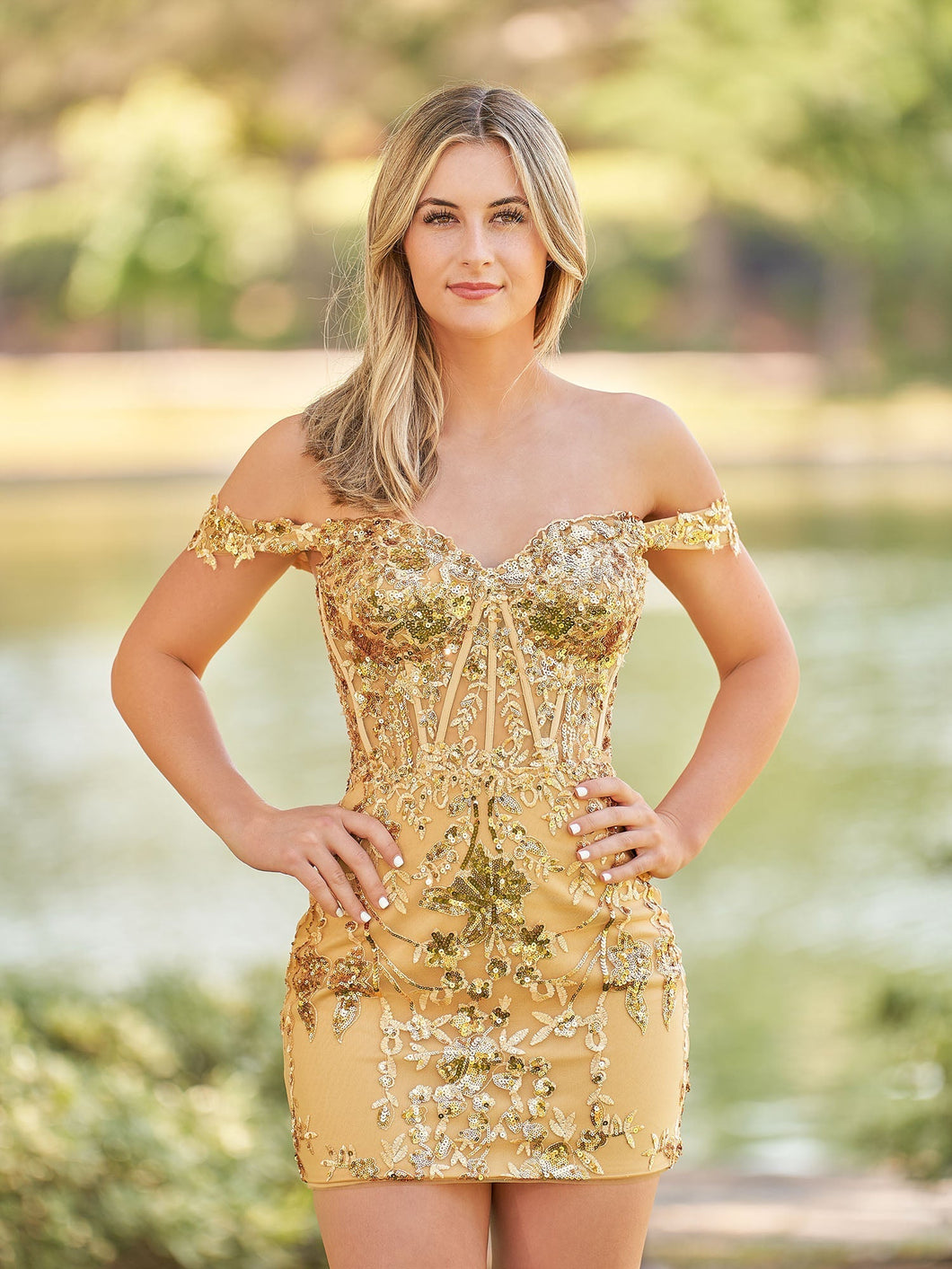 Introducing dress -a luxurious gold lace sheath-style dress with a short mini length and off-the-shoulder neckline. Perfect for homecoming or any special occasion. the dress features a sleeveless design with a lace-up back for a flattering fit and is embellished with sequin lace for added elegance. Get ready to shine in the spotlight with the dress.