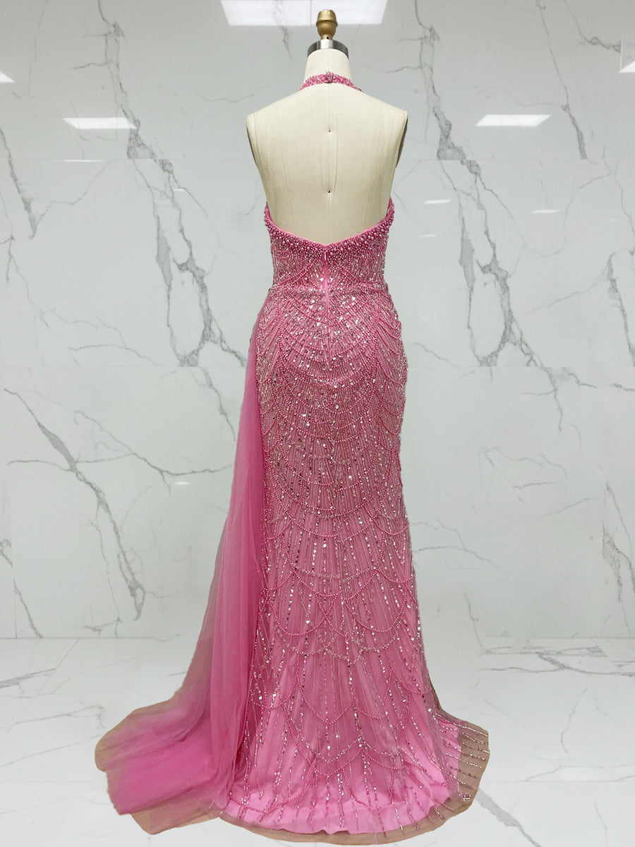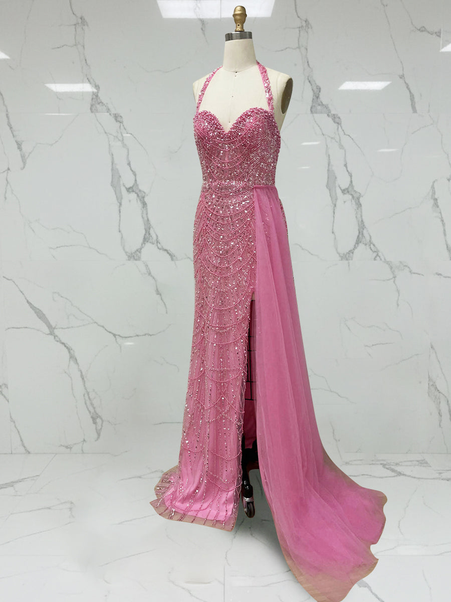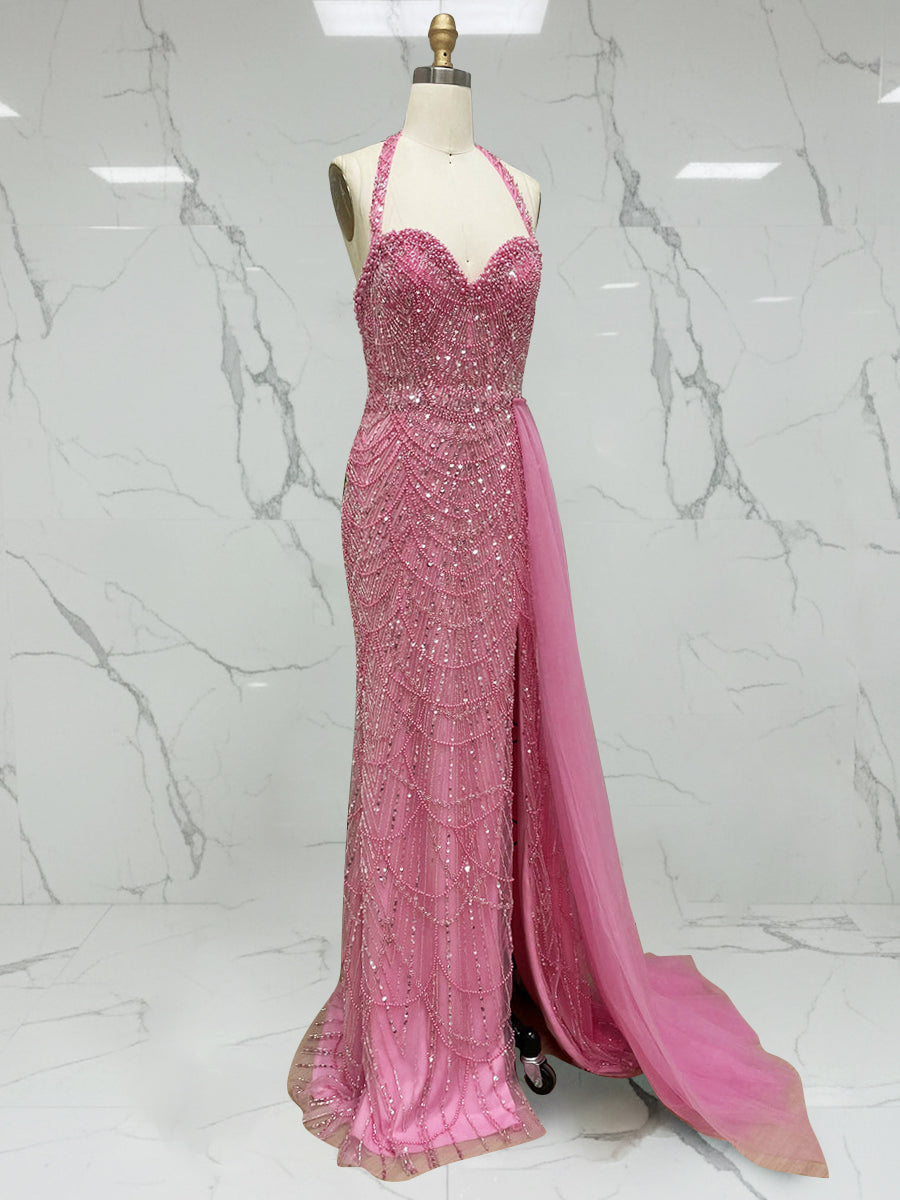 Glamorous Hot Pink Beaded Halter Prom Dress with High Slit