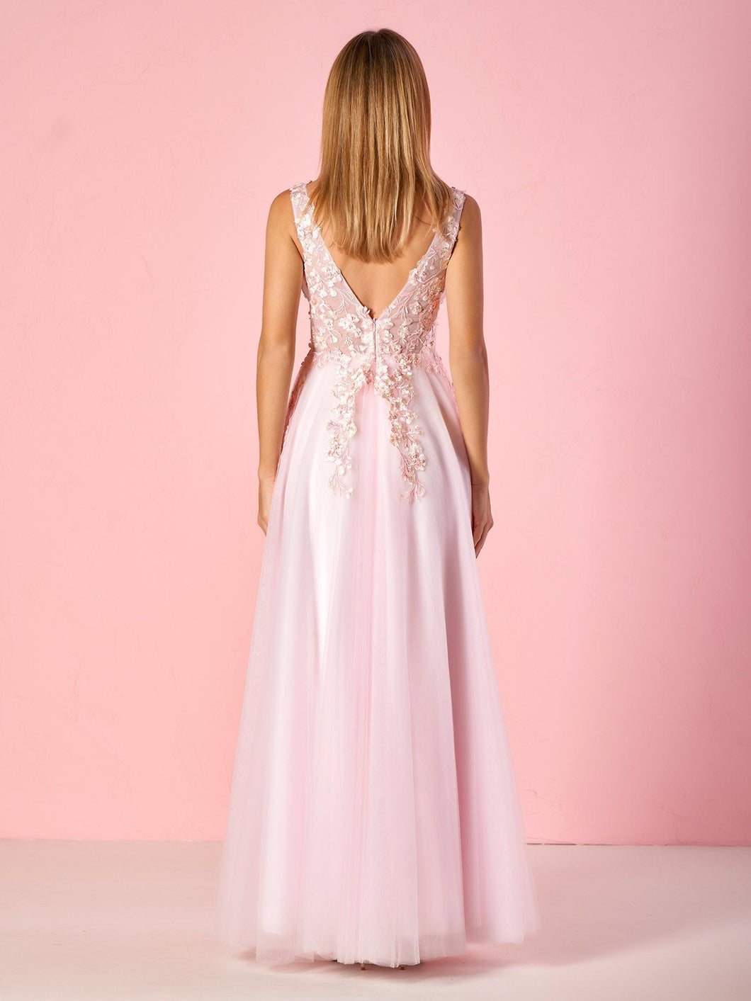 Experience the sublime blend of style and sophistication with our A-line V-neck Tulle Floor-Length Prom Dress. Delicately draped in luscious pink tulle. this dress promises an entrance that no one will forget. The A-line silhouette provides a flattering fit for all body types. while the deep V-neckline adds a sensual touch to this classic design. The corset illusion bodice enhances your natural shape. adding a layer of intrigue and allure to the design. From the moment you step onto the dance floor. you'll capture everyone's attention with your enchanting presence.