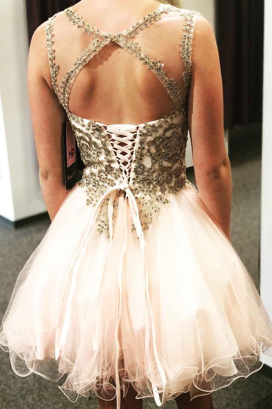 Be the life of the party with this stunning lace-up beaded cross back short prom dress. With beautiful beading along the neckline and back. you'll look amazing on your special night. This short dress is sure to make a statement and leave a lasting impression.