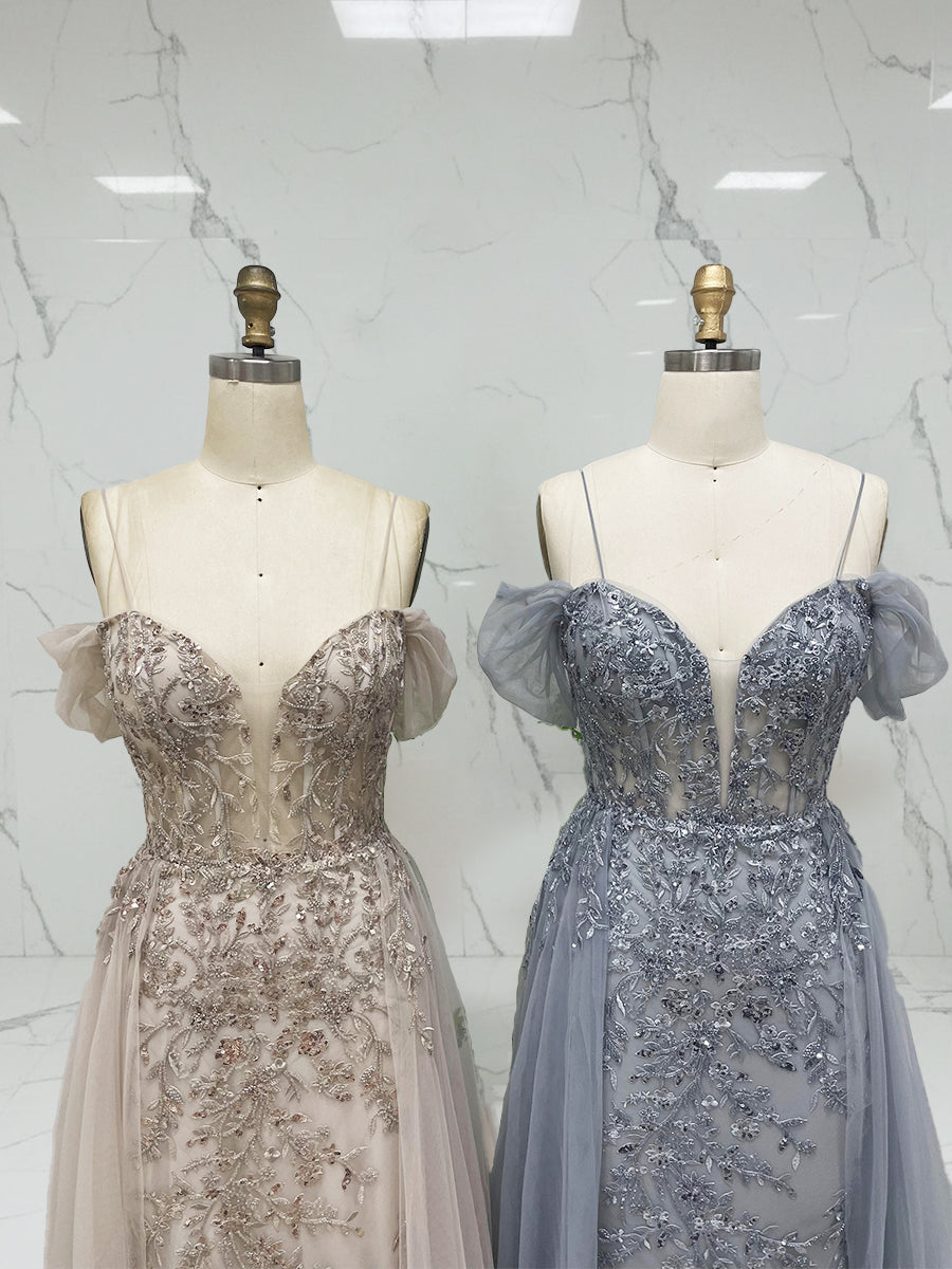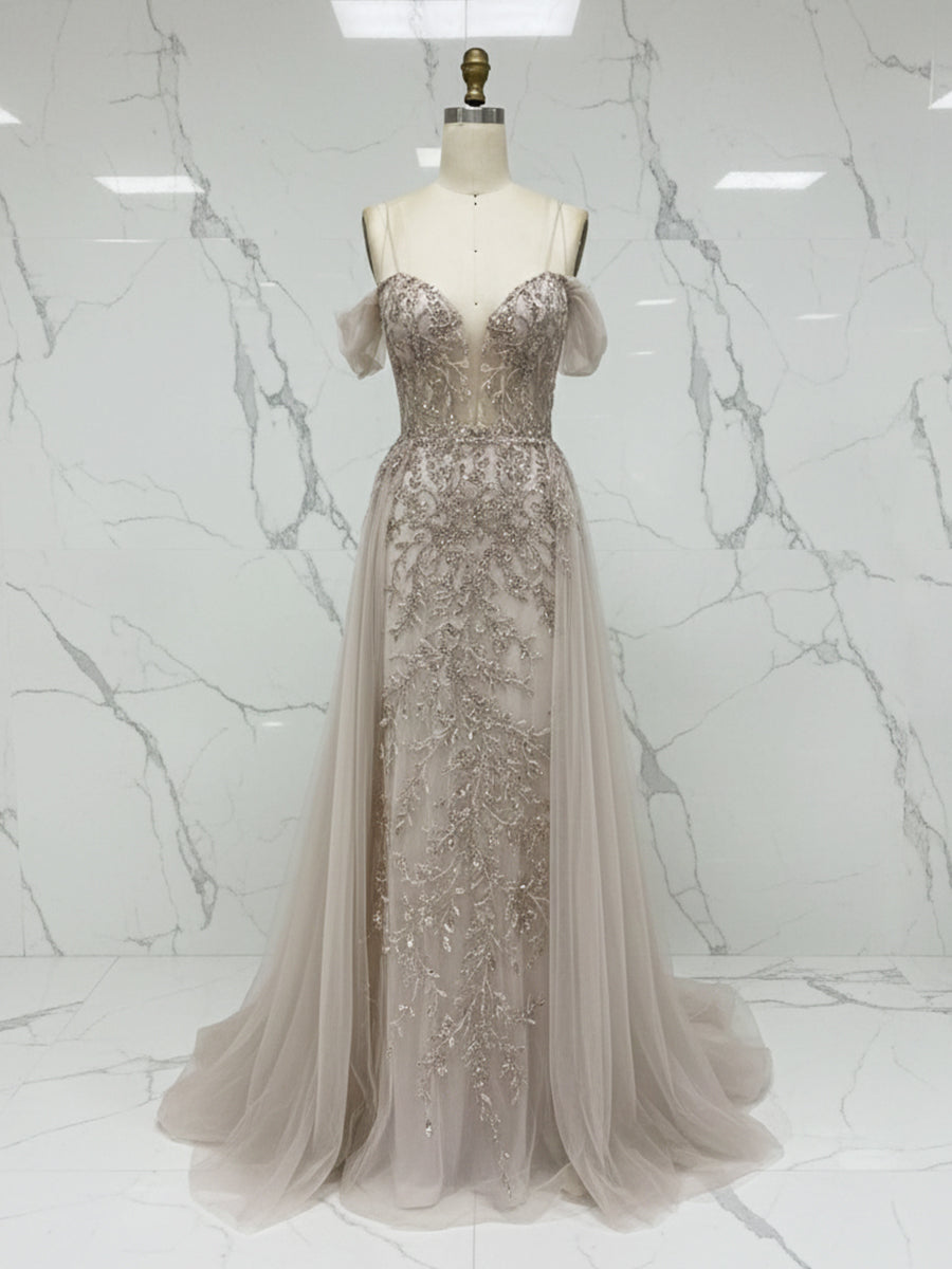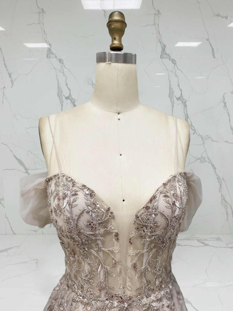 Luxurious Champagne Beaded Off-the-Shoulder Prom Dress with Tulle Train