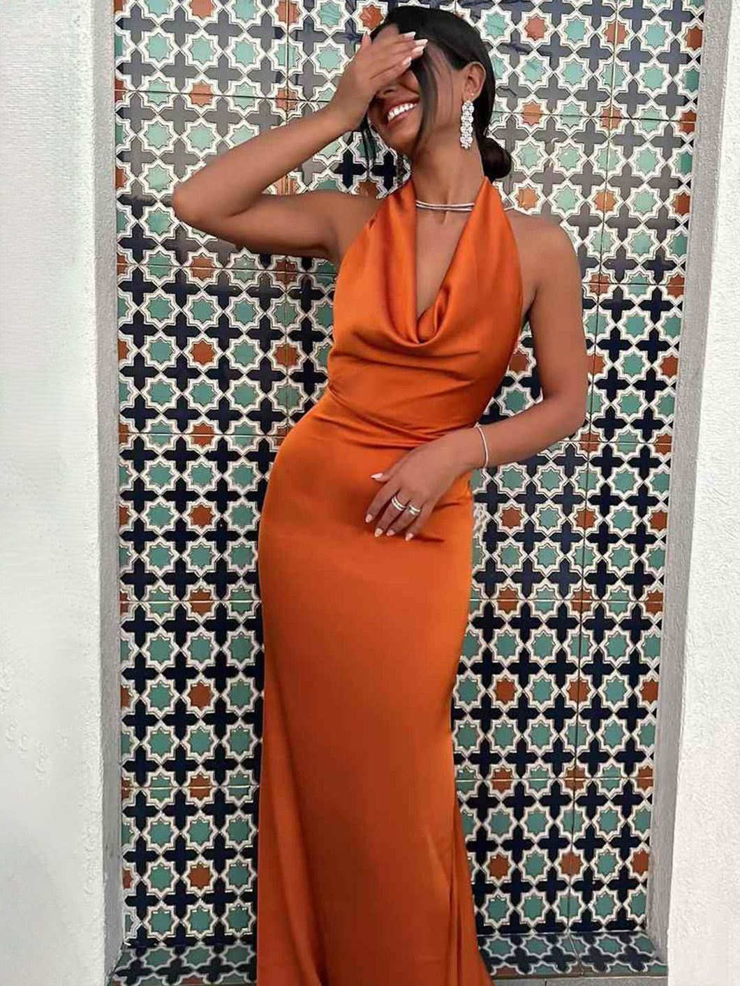 This captivating mermaid-style gown. available in vibrant orange and rich burgundy satin. is designed to turn heads. The halter neckline adds a chic and flattering touch. while the sleeveless silhouette exudes modern sophistication. A stylish choice suitable for both evening dresses and formal dresses. highlighted by its pleated embellishments on the gown. creating a stunning. textured effect that complements the figure-hugging shape. With a sweep train for a dramatic finish and a lace-up back for a customizable fit. this gown is perfect for those who want to make a bold yet elegant statement at their next formal event.