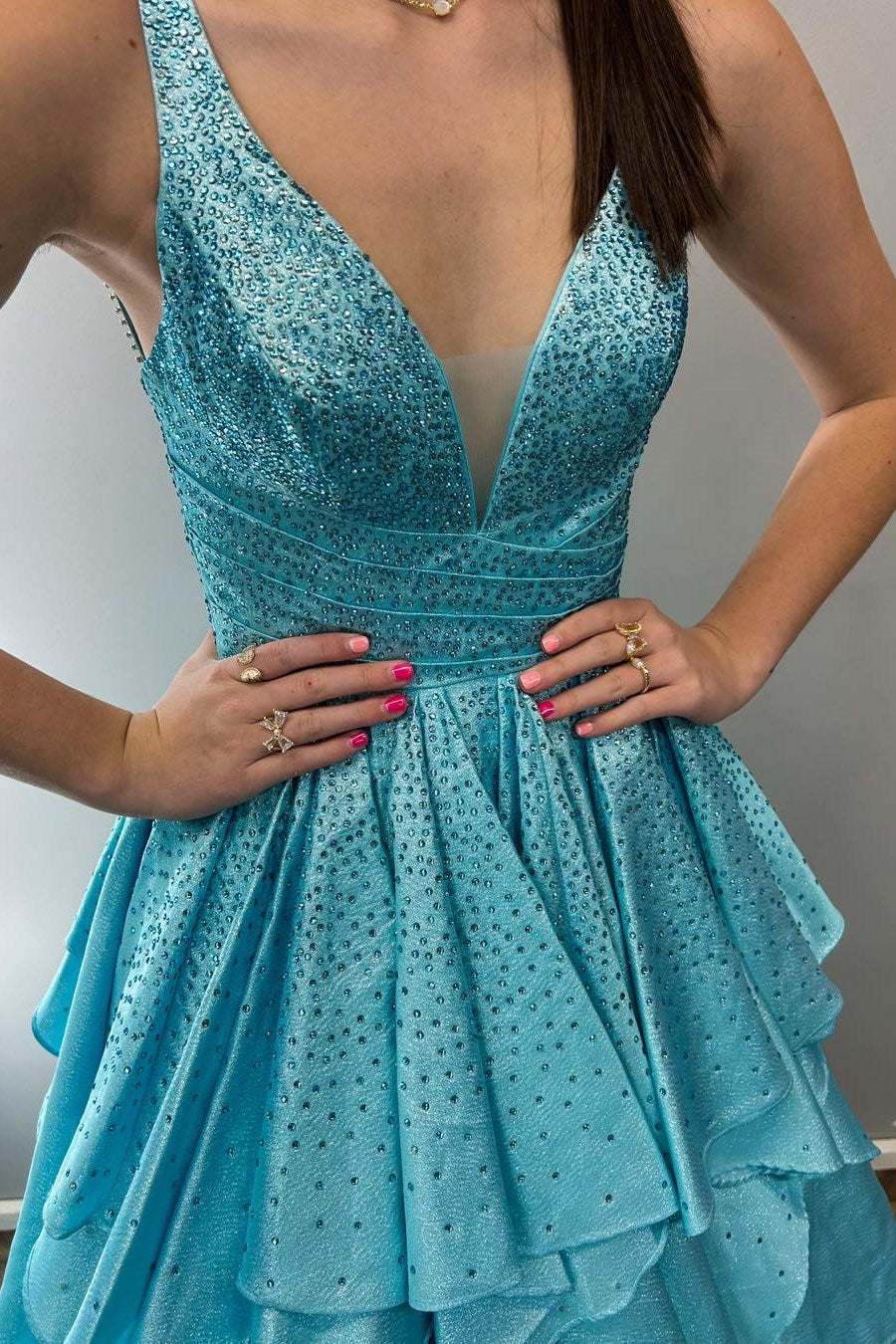 Nacre | Aqua Blue Hot Stone Multi-Layer Ruffle Long Prom Dress