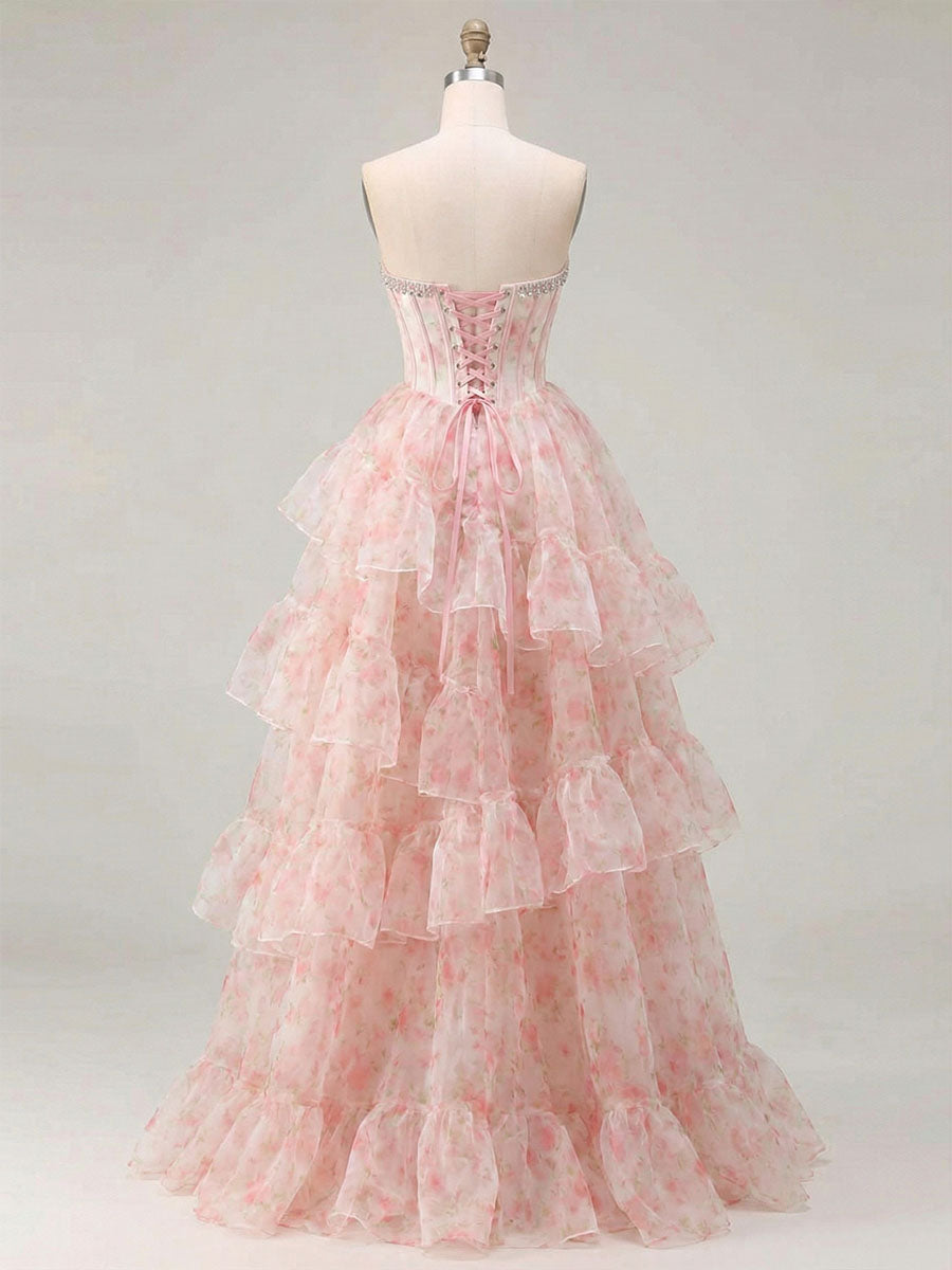 Pink Floral Print Organza Strapless Crystal Trimmed Corset Tiered Prom Dress