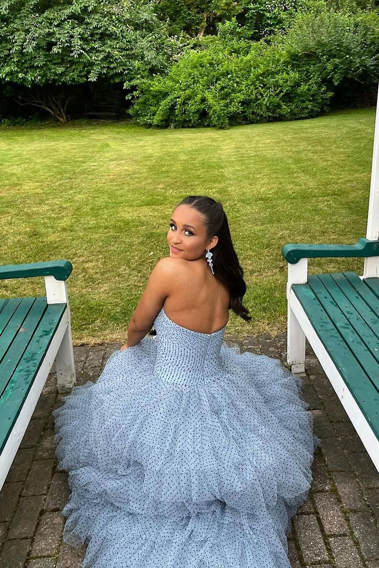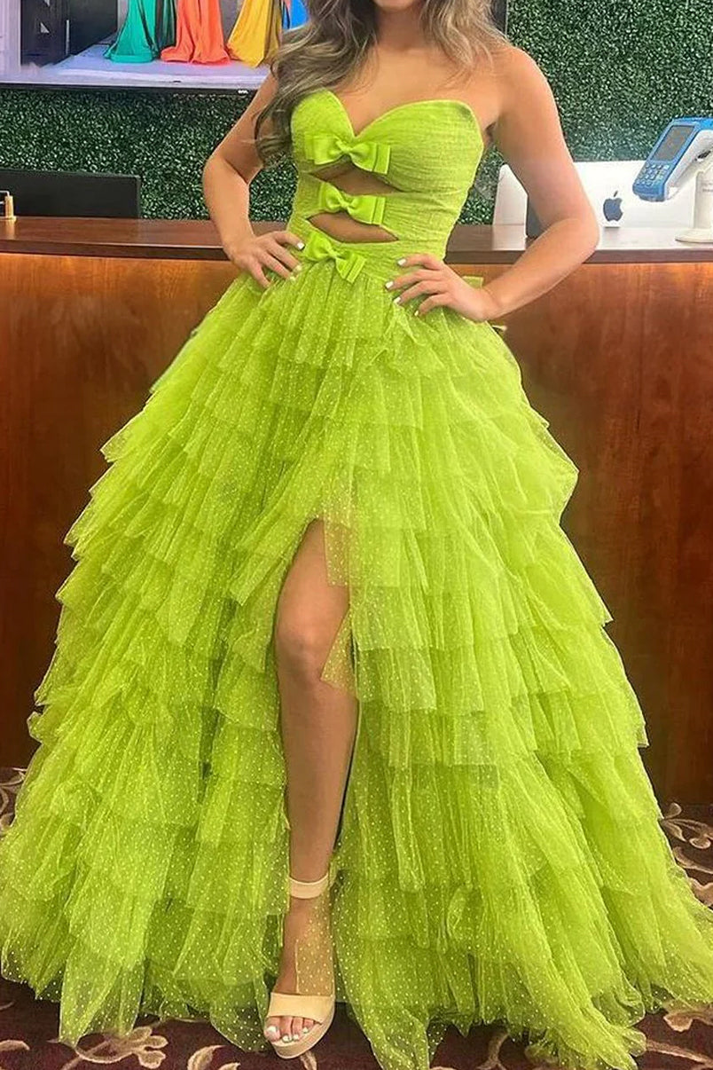 Embrace timeless elegance with the Polka Dot Strapless Ruffle Tiered Prom Gown. This enchanting A-line dress features a strapless neckline that elegantly frames the face. complemented by a playful polka dot pattern. An ideal choice for both evening dresses and formal dresses. with its tiered ruffles add a touch of whimsy. cascading into a sweeping train for a dramatic finish. It is available in a range of vibrant colors including red. ivory. white. and blue which is designed to make you stand out.