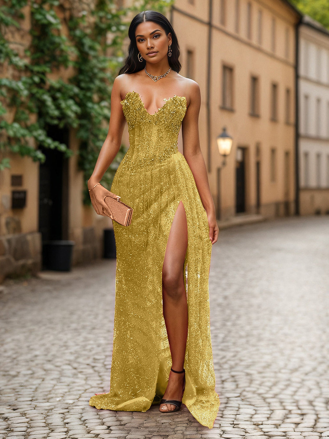 • Embellishment: Beaded Fringe. 3D Crystal Neckline. Allover Sequins