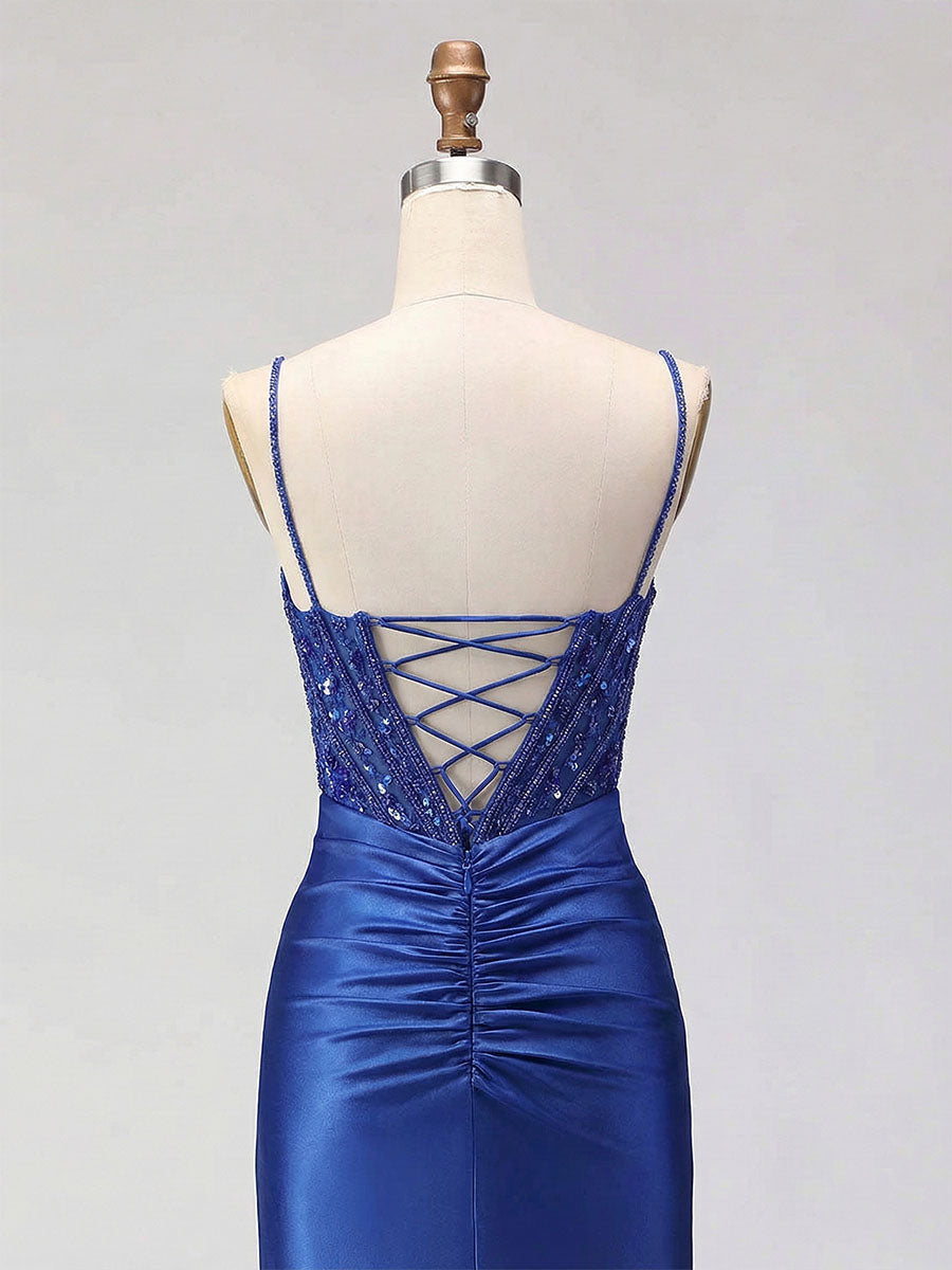 Royal Blue Beaded Corset Satin Prom Dress with High Slit