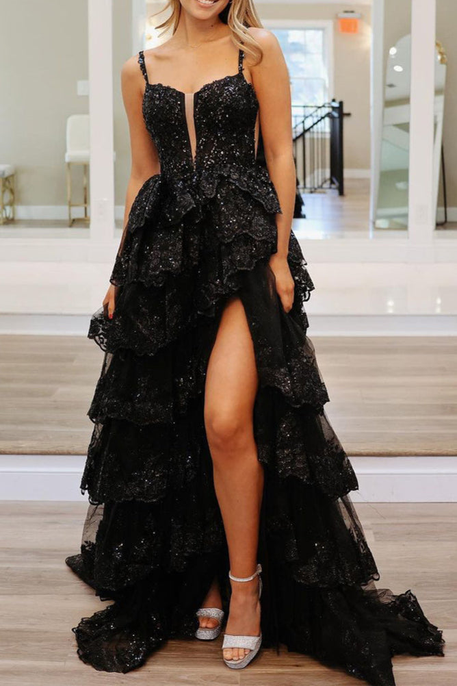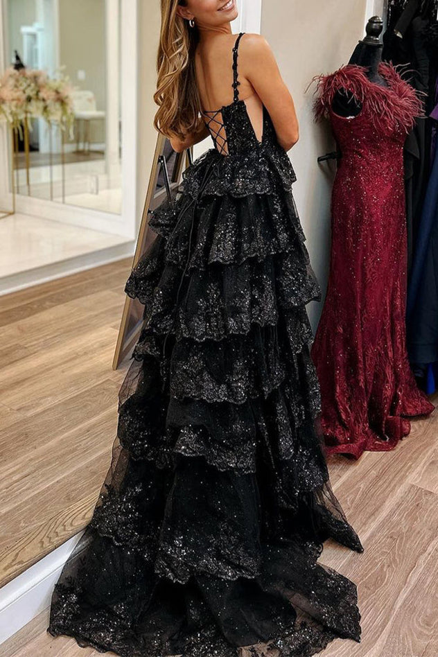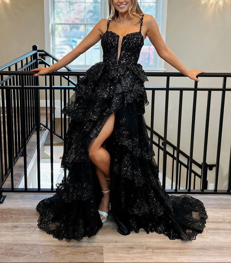 This dazzling A-line gown. made from glitter tulle fabric. brings an unforgettable sparkle to any special occasion. Available in bold hues of fuchsia. purple. and classic black. it exudes glamour and sophistication. The spaghetti straps add a delicate touch. while the sleeveless design highlights your shoulders and arms. An ideal choice for both evening dresses and formal dresses. with its flattering slit adds a hint of allure. and the sweep train ensures graceful movement as you make your entrance. The lace-up back provides a customized fit. combining comfort with style. Perfect for a glamorous evening event or formal gathering. this dress will have you feeling like the center of attention.