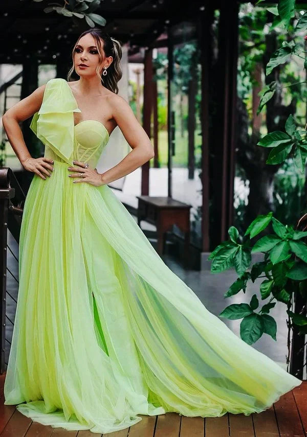 Experience elegance and allure with our Yellow Prom Dress. featuring a unique one-shoulder design and a sexy high slit. The flowing layered tulle skirt creates a luxurious look. while the long floor length provides a sophisticated silhouette. The no sleeve design adds to the modern style.