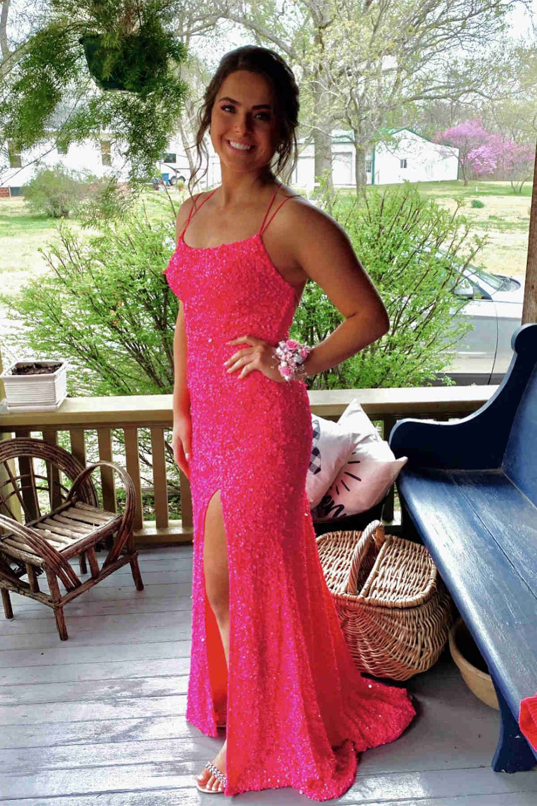 Elegant long prom dress features double straps. sequins and high slit. Inexpensive but Good Quality.