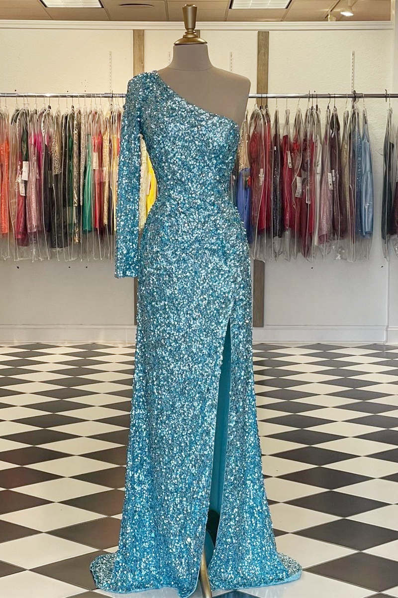 Elegant blue long prom dress features long sleeves and high slit. Inexpensive but Good Quality.